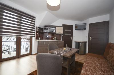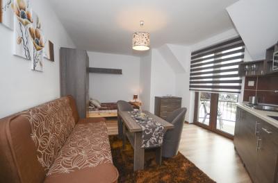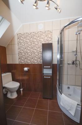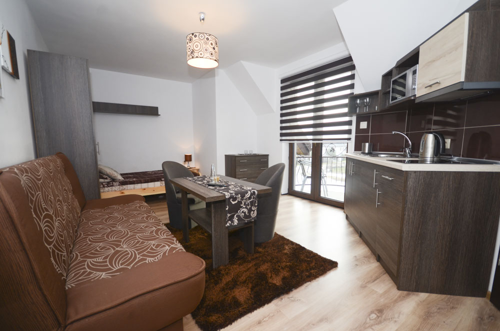 Pokój trzyosobowy z możliwością dostawki znajduje się na drugim piętrze budynku. Dodatkowo każdy z Gości posiada w pokoju w pełni wyposażoną kuchnię oraz łazienkę z pełnym węzłem sanitarnym. Dla najmłodszych na terenie obiektu znajduje się duży plac zabaw wraz z trampoliną i basenem chińskim ze zjeżdżalniami i torami przeszkód.