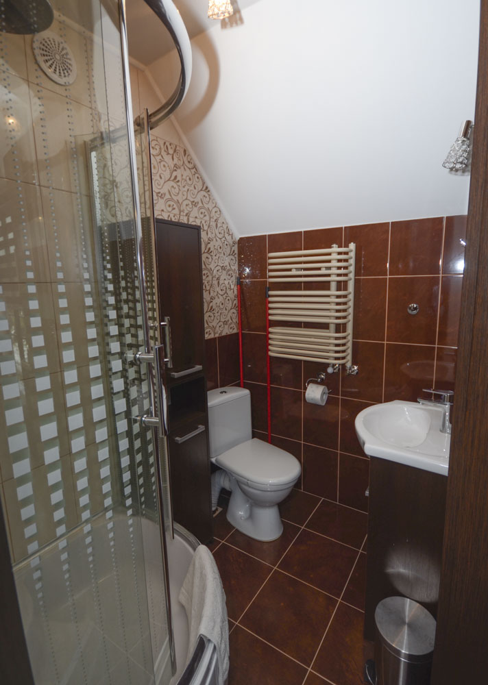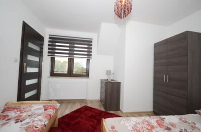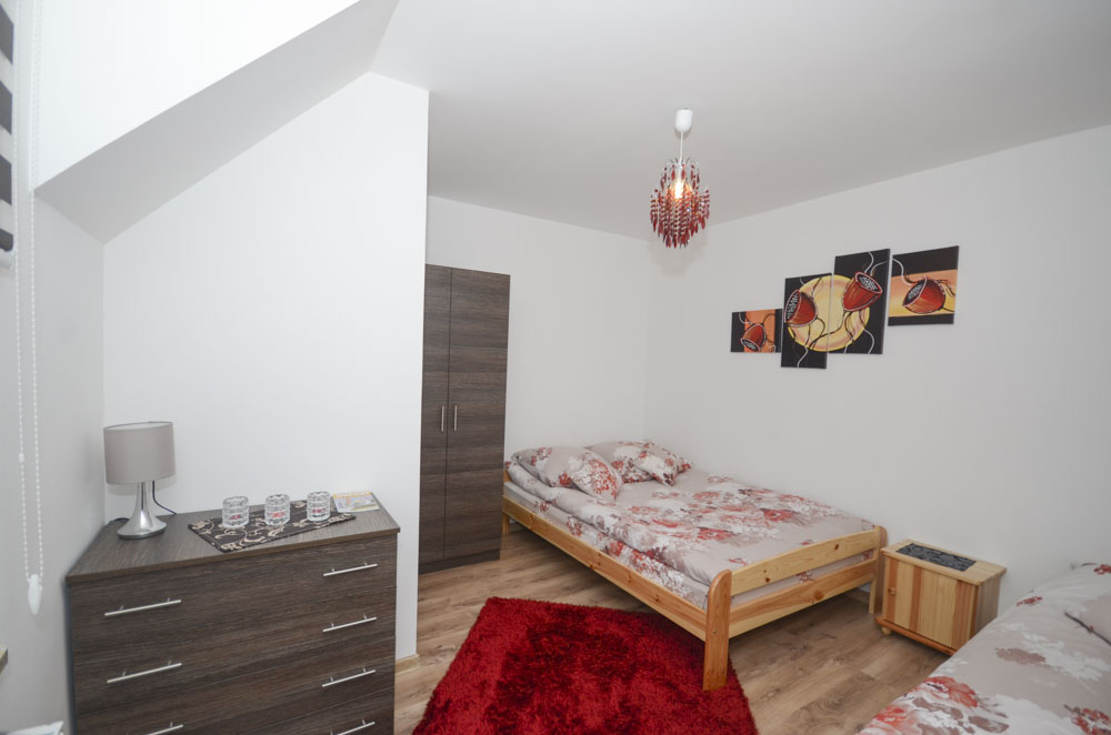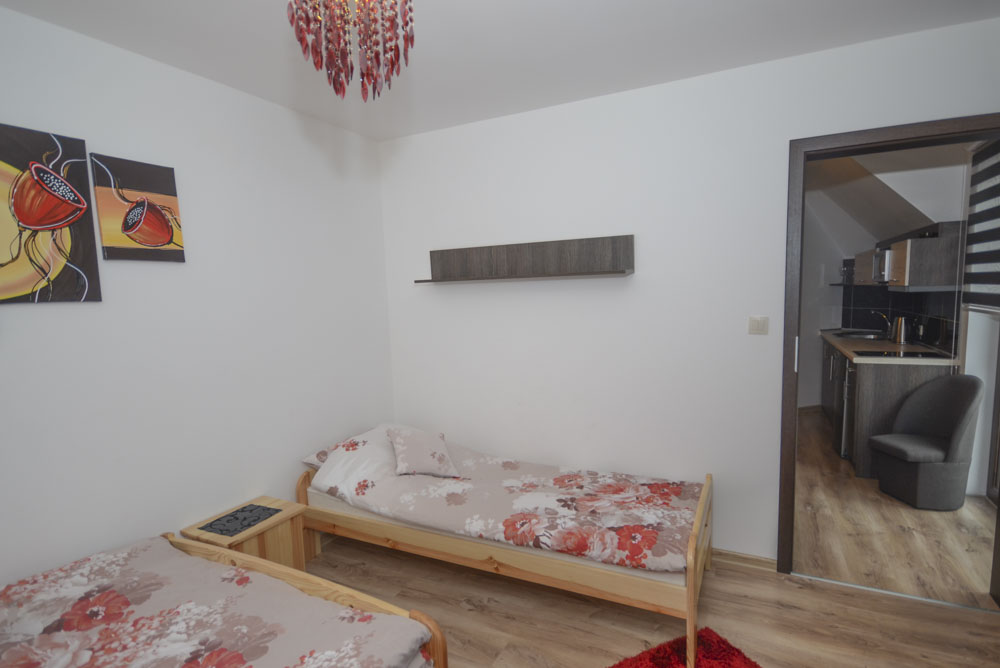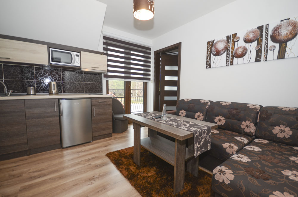 Dwupokojowy apartament (4 osobowy) z możliwością dostawki znajduje się na drugim piętrze budynku. Dodatkowo każdy z Gości posiada w apartamencie w pełni wyposażoną kuchnię oraz łazienkę z pełnym węzłem sanitarnym. Dla najmłodszych na terenie obiektu znajduje się duży plac zabaw wraz z trampoliną i basenem chińskim ze zjeżdżalniami i torami przeszkód.